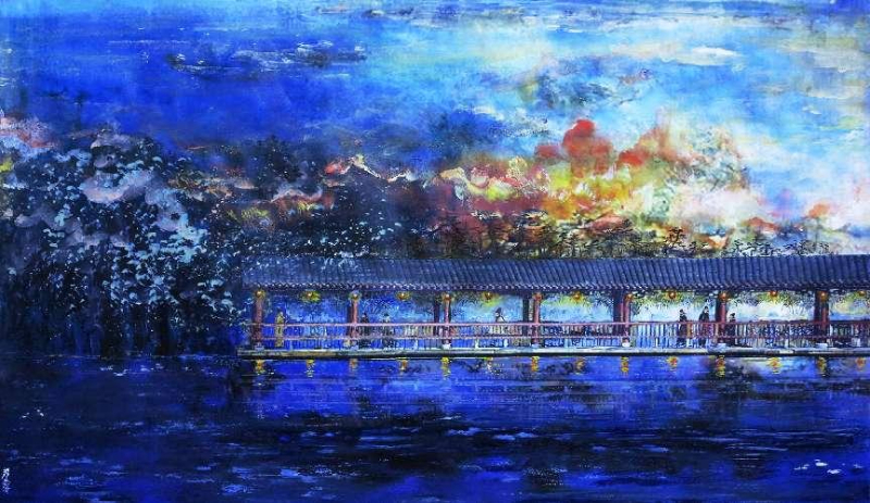 君寿认为,夜色柔光漫洒,是温和平静的,与之白天的光线、色彩相比,它没有躁动的直感。万物的本色在夜光中会变换出无尽的色彩,给人以无限的遐想,喜乐哀忧、诗情画意尽在梦境的夜色中,无边无际的延伸去发现夜色的美并置身其中。所以在众多绘画题材中,君寿尤为喜爱夜色,创作了《夜色廊桥》这一作品。