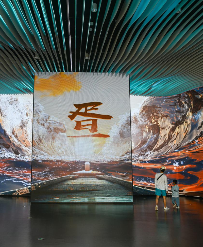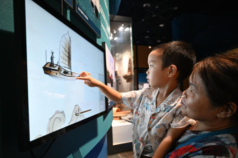 5月13日,游客在海南疍家博物馆观看展现疍家渔排底部水产养殖的动画。
