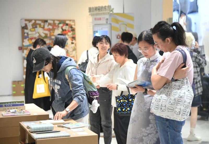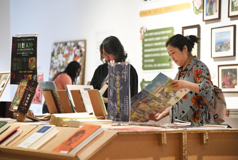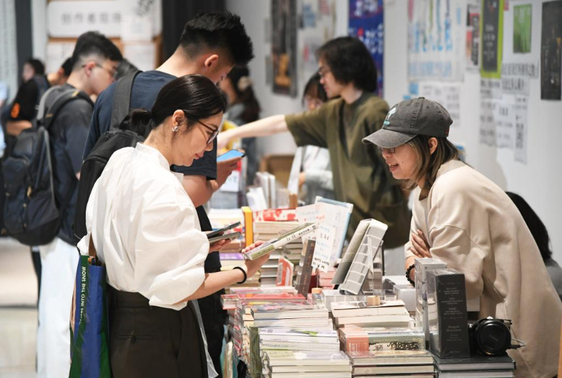 5月15日,观众在图书市集上观看书籍。