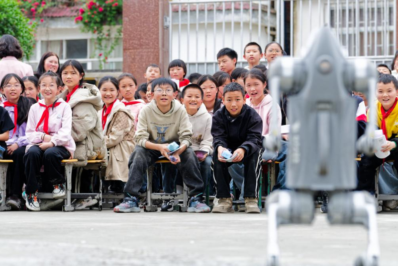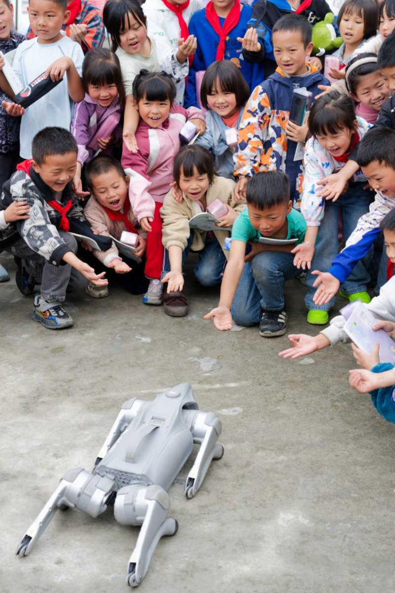 5月28日,在昭通市大关县翠华镇庆云小学,学生们与四足机器人互动。