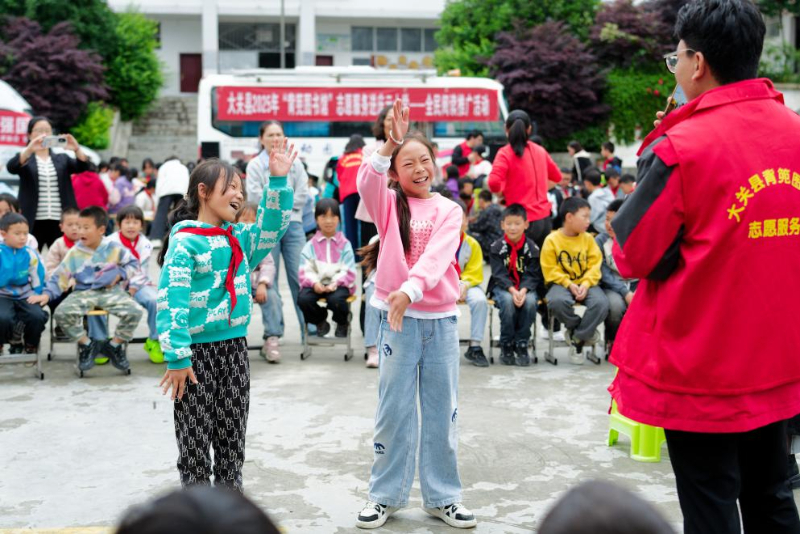 5月28日,昭通市大关县翠华镇庆云小学的学生们在游戏环节表演舞蹈。