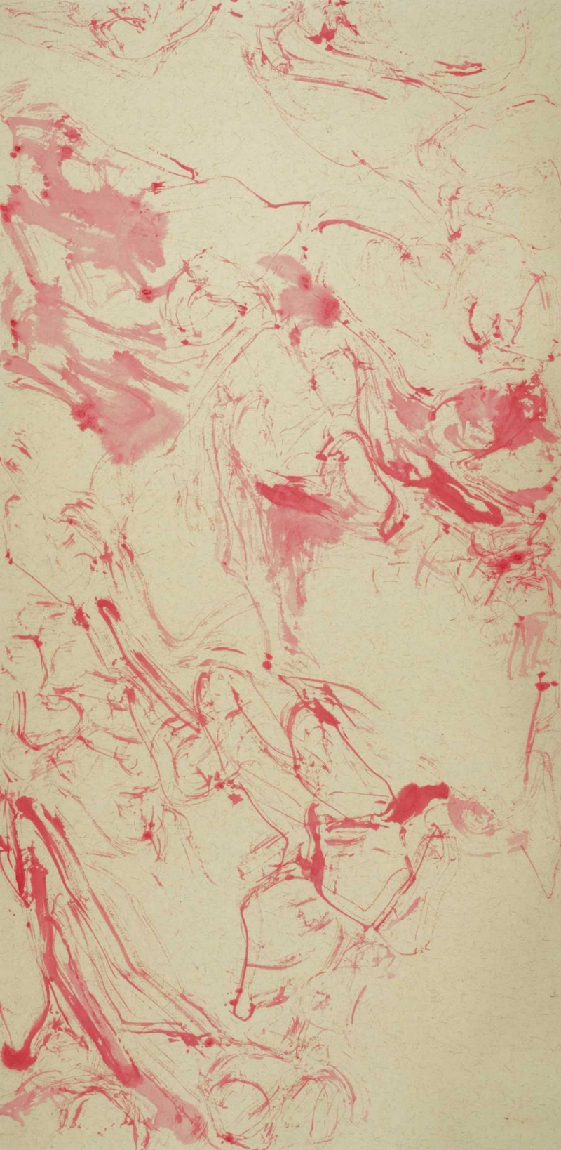 《观沧海》则以朱砂替代墨色,演绎传统勾、皴、擦、点、染技法。笔触时而刚健、时而飘逸,浓淡干湿、长短轻重的变化,不再服务于山石江河的形态与空间,而是化作独立抽象的符号,以心象构成新的意味形式,尽显艺术表达的创新巧思。这种既熟悉又陌生的语言,根植中华文化,融合东方哲学与现代表现,形成独特美学。