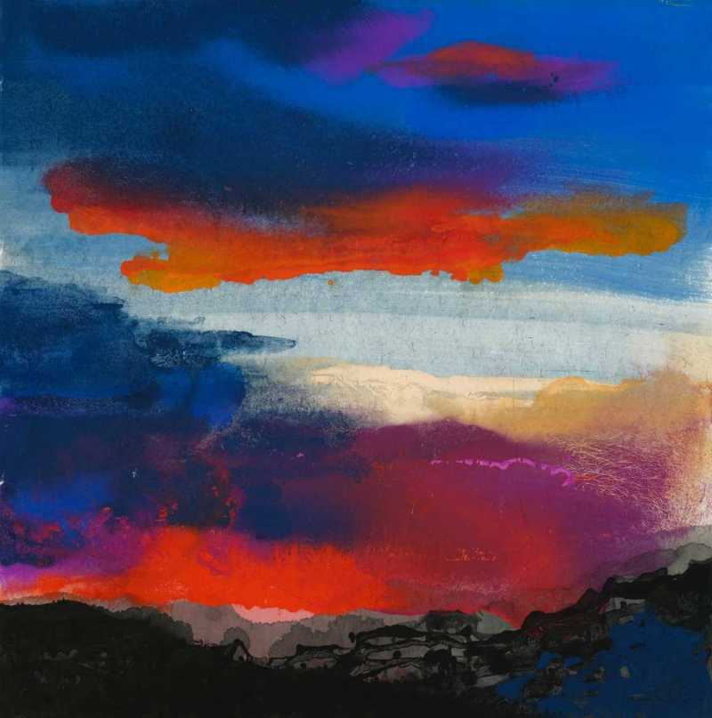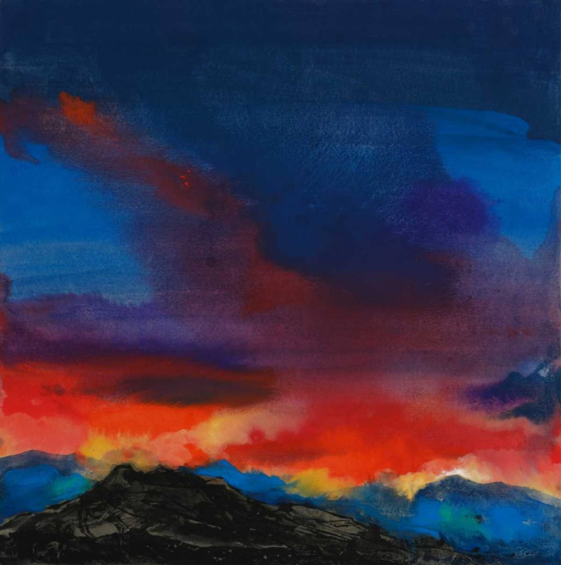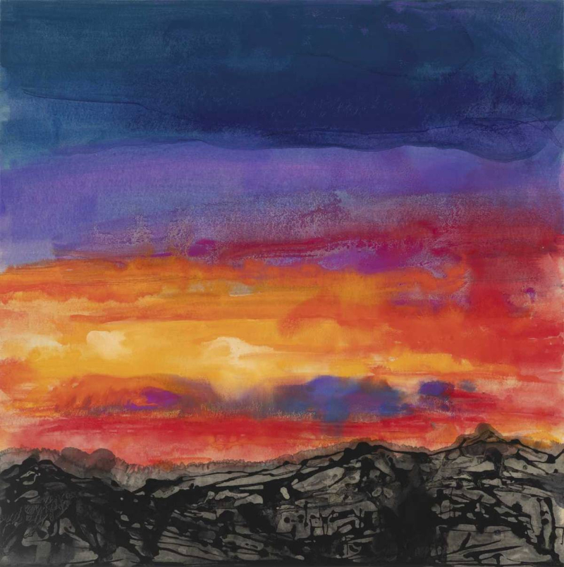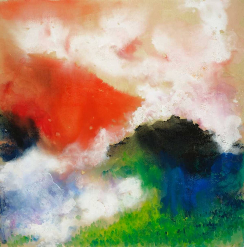 《兴云破日》则展现文蔚对石色与墨色交融的娴熟掌控。石青石绿、朱砂与墨色组合,营造出介于具象与抽象间的山影色影,泼彩达至“无墨胜有墨、无笔胜有笔”的境界。这份自然流韵,是她深耕传统山水造形、审美与笔墨的沉淀,更是传统与创新的完美融合。