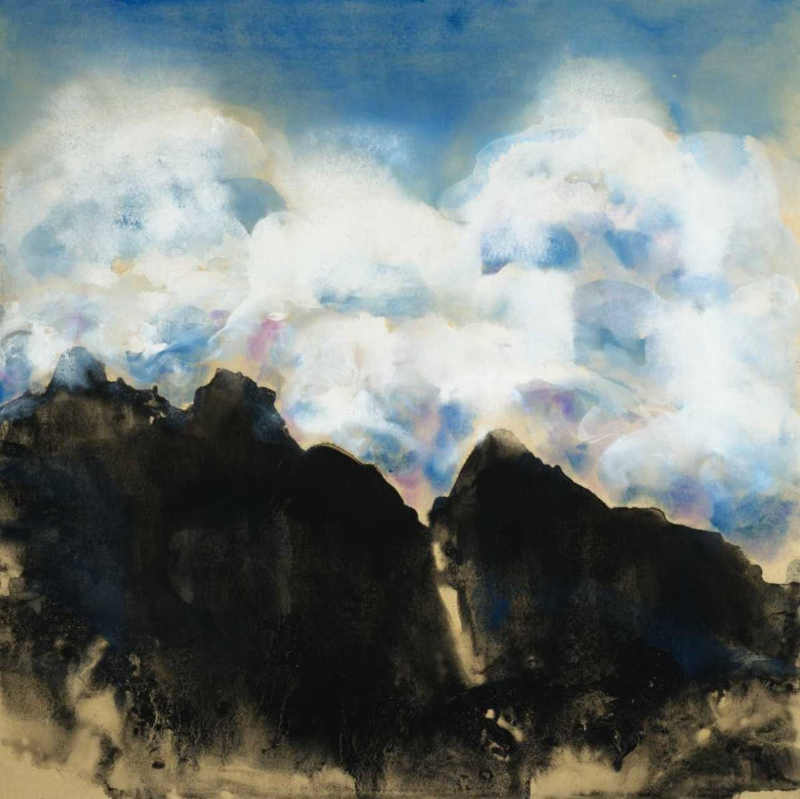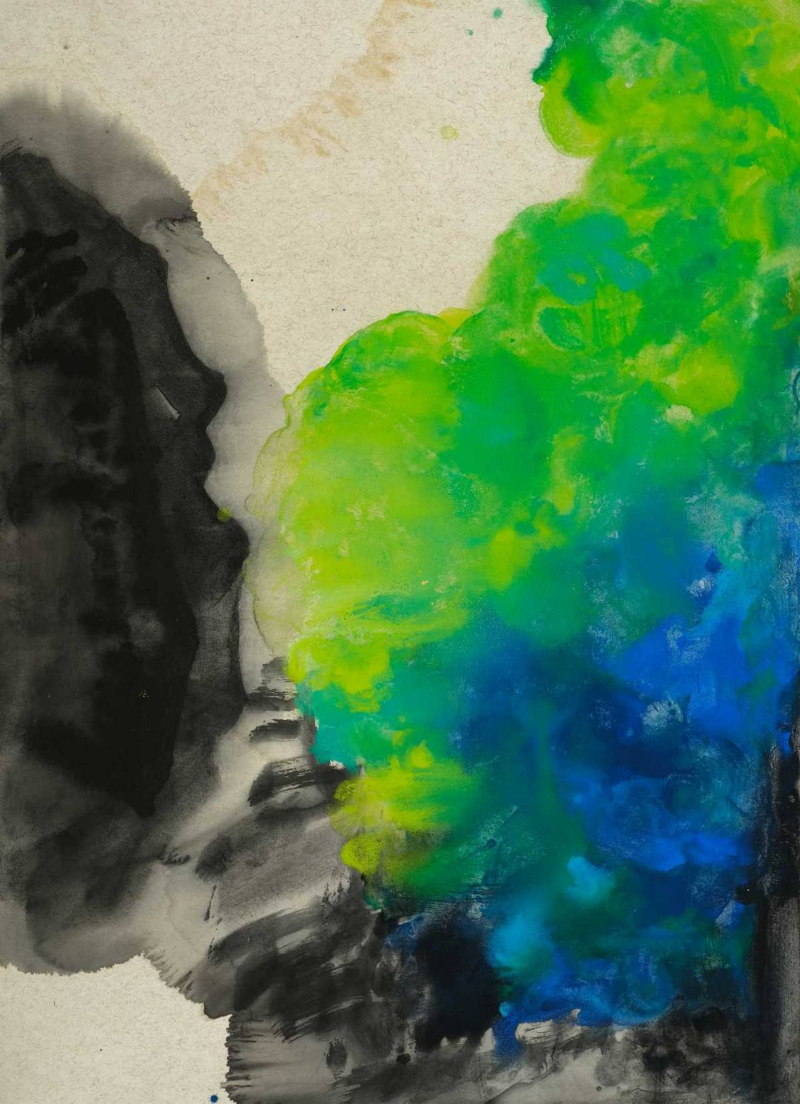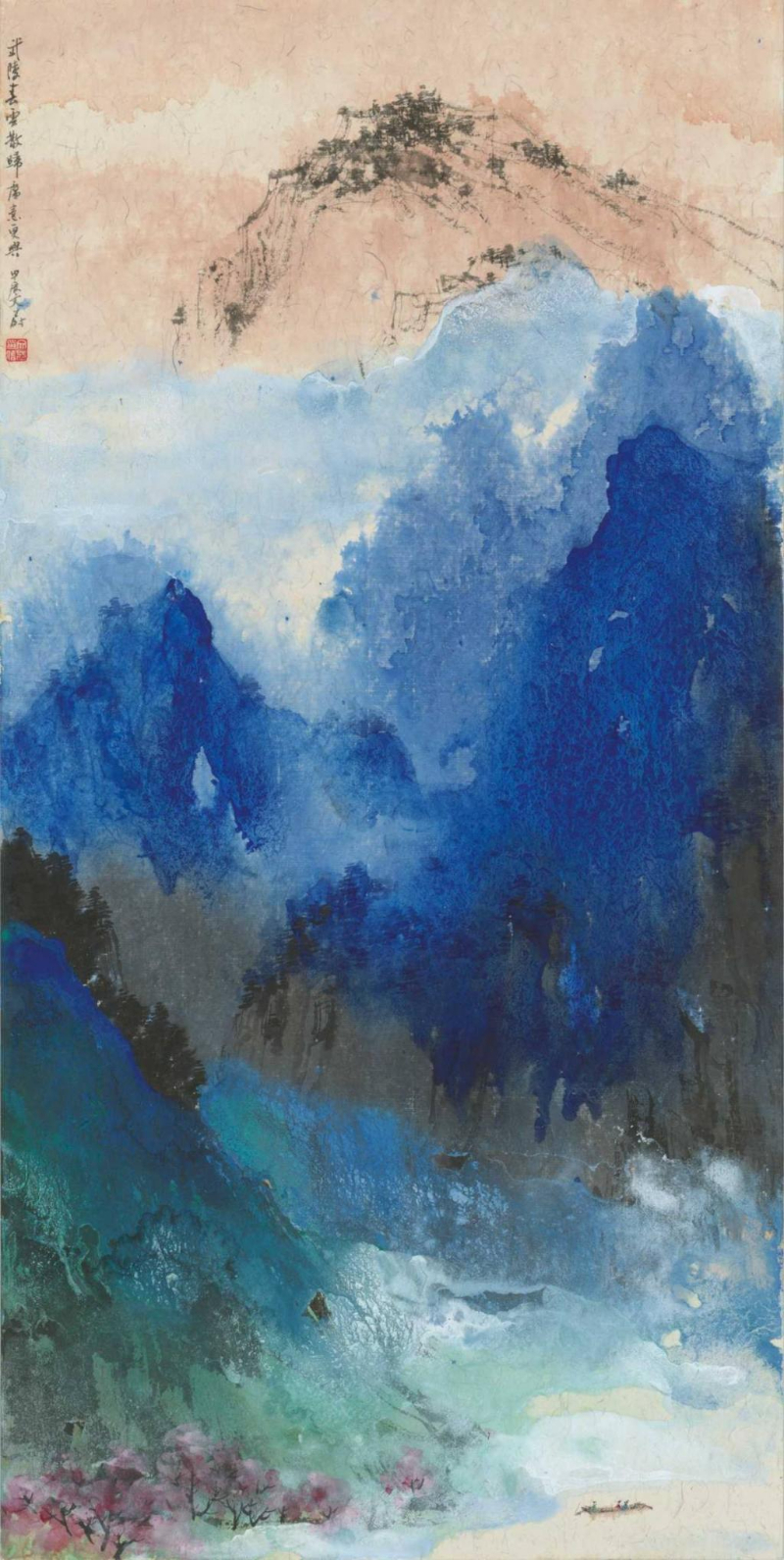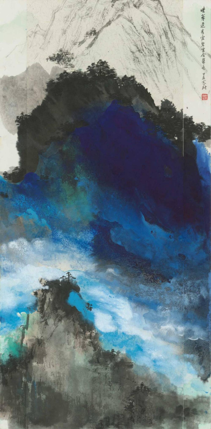 《空山白》中,灰墨泼染的山形如太古洪荒,一线银练瀑布注入灵动;山间白云以石青、石绿、朱膘揉染,色墨在水中自然晕化,成就“云蒸霞蔚”的奇观。这抹青绿,既是李白笔下“处处长随君”的漂泊云影,也是画家逸气的具象表达。