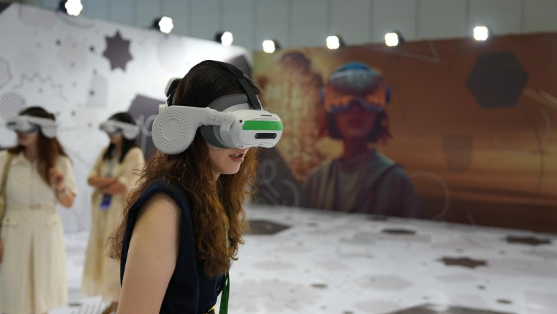 8月28日,观众在博览会上观看XR沉浸式电影《了不起的甲骨文·王子的荣耀》。