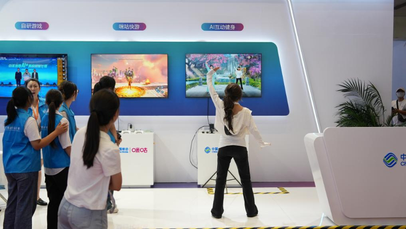 8月28日,观众在博览会上体验AI互动项目。