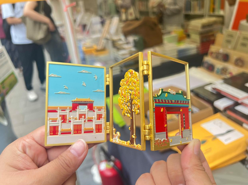 《我与地坛(图像小说)》、“我与地坛”冰箱贴、史铁生金句书包更是在本次书市大放光彩。最受读者关注的《我与地坛(图像小说)》,是史铁生的作品首次以图像小说形式呈现。读者张女士注意到,插画以坐在长椅上的“我”为主观视角,选取《我与地坛》文中的古树、车辙、夜空、看不见的“园神”等经典意象描绘,与文本有机呼应。读者在阅读中,仿佛亲身置于园中,穿越时空,沉浸式地感受地坛的岁月流转,走进史铁生的精神世界。而在广西师范大学出版社展位,记者看到一款新颖别致的“我与地坛”三折叠冰箱贴,地坛公园正门、方泽坛与银杏树巧妙合成一体,工作人员闫金金说:“去年我们的‘地坛看海’冰箱贴非常火爆,今年我们做出了更有意义更好看的新款。”走进“我在地坛”书店展位,史铁生金句书包受到读者的热切关注,一款火红的书包上,“在满园弥漫的沉静光芒中,一个人更容易看到时间,并看见自己的身影”直击人心;另一款绿色的书包上,“在人口密聚的城市里,有这样一个宁静的去处,像是上帝的苦心安排”引人遐思。