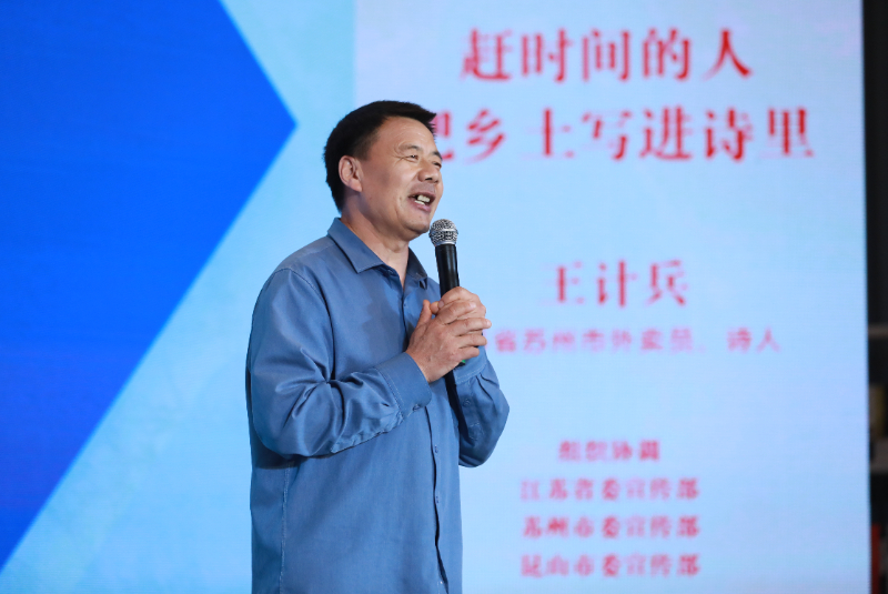 图为王计兵以《赶时间的人,把乡土写进诗里》为题进行分享。