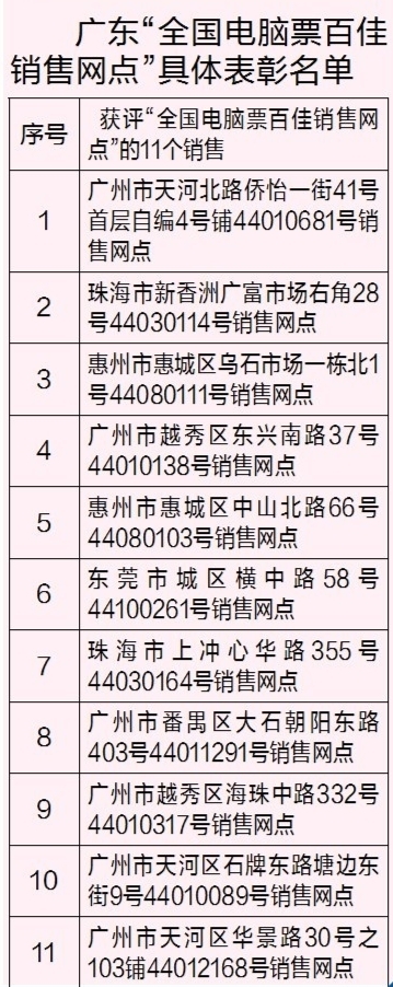 为鼓励先进,进一步调动各销售网点的积极性和主动性,增强销售人员职业荣誉感和使命感,凝心聚力做好今年的电脑票销售管理工作,日前,中国福利彩票发行管理中心对2021年度全国电脑票百佳销售网点进行了表彰,广东省(不含深圳市)四地共11家福彩销售网点荣登“全国电脑票百佳销售网点”榜单,其中广州市6家、珠海市及惠州市各2家、东莞市1家。据悉,广东是荣获“全国电脑票百佳销售网点”最多表彰名额的省份。