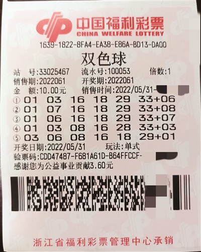 2022年5月31日晚,福彩“双色球”第2022061期开奖,当期开出的中奖号码为:红色01 03 16 18 29 33 蓝色06,一位宁波彩友仅花10元便击中了当期的1注一等奖和若干小奖,共获得税前奖金10000420元。这不仅是宁波地区5月的第二注“双色球”一等奖,也是宁波地区本年度的第十注“双色球”一等奖。