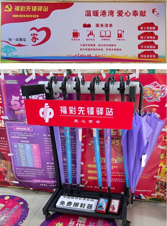 该福彩“先锋驿站”设立于宜城街道朝阳路32025813投注站,它的功能是为户外需要帮助的群体提供服务。一把雨伞,一杯热茶,让需要的人在酷暑中感到一丝凉爽,在严寒中感受一份温情。