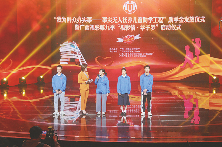 其中。2013年创办的“福彩情·学子梦”助学活动在2021年有一个新的亮点:在自治区财政厅的支持下,自治区民政厅、广西福彩中心积极筹措资金100万元,对2021年全区170名考入普通全日制本科学校、普通全日制专科学校、高等职业学校等高等院校就读的事实无人抚养儿童学生进行资助,为莘莘学子健康快乐成长贡献力量,传递党和政府对广大少年儿童的关怀和温暖,不断增强孩子们的获得感、幸福感和安全感。