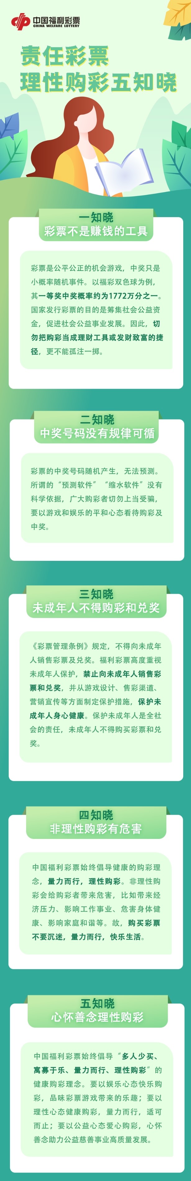 中国福利彩票始终倡导“多人少买、寓募于乐、量力而行、理性购彩”的健康购彩理念。要以娱乐心态快乐购彩,品味彩票游戏带来的乐趣;要以理性心态健康购彩,量力而行,适可而止;要以公益心态爱心购彩,心怀善念助力公益慈善事业高质量发展。