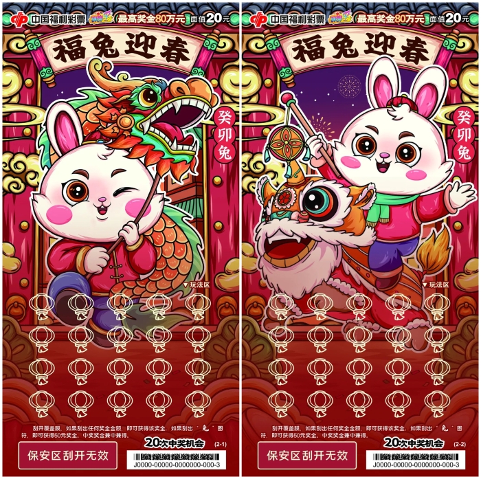 “福兔迎春”面值20元,全套2张,采用国潮手绘的明信片设计风格,将福兔舞龙舞狮的生动画面呈现于票面之上,与春节的喜庆祥和氛围相契合。刮开区的灯笼奖符,细腻而动感,与主题呼应。该游戏最高奖金80万元,中奖奖金兼中兼得。