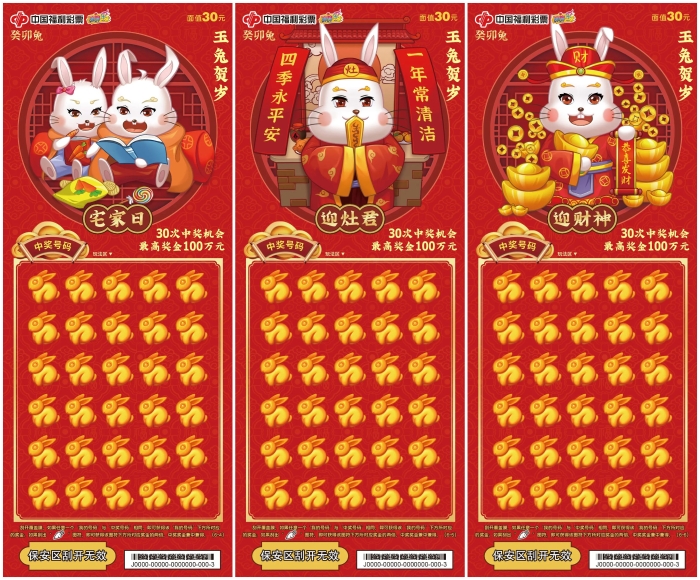 “玉兔贺岁”面值30元,全套6张,以除夕到初五的过年民俗为设计思路,巧妙地用拟人化手法,演绎了辞旧岁、拜大年、回娘家、宅家日、迎灶君、迎财神6个主题,讲述了春节文化故事,增加了生肖票的“年味”。该游戏最高奖金100万元,30次中奖机会,奖金兼中兼得。