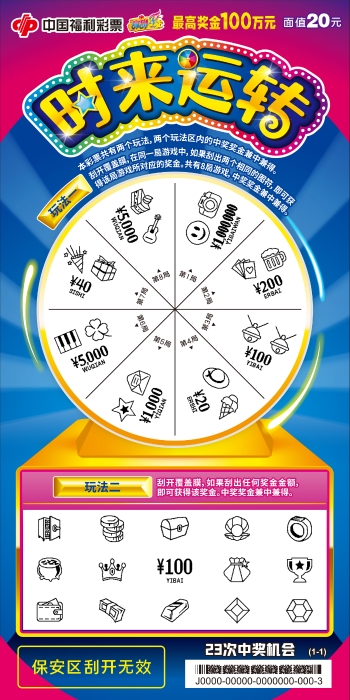 “时来运转”刮刮乐游戏单张面值20元,有两个玩法、23次中奖机会,奖金兼中兼得,最高奖金100万元。