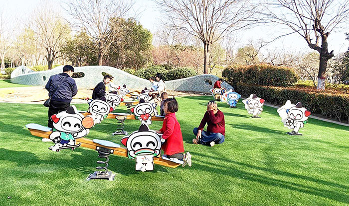 儿童乐园一亮相,就吸引了不少市民带着孩子前去游玩,不同形态的乐小星伴着孩子们在跷跷板上玩耍时上下跳跃,栩栩如生,仿佛在和他们一起玩耍,园区里洋溢着孩子们欢快的笑声。