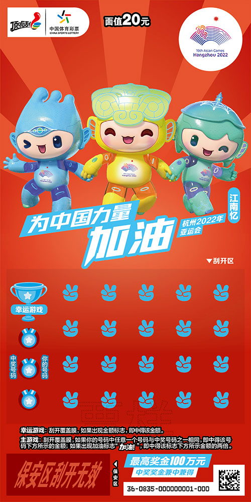 在杭州亚运会开幕倒计时200天之际,浙江体彩推出“为中国力量加油”杭州亚运会主题即开型体育彩票,票面以亚运会吉祥物“琮琮”“莲莲”“宸宸”为主体形象,将具有亲和力的吉祥物与充满活力的网球、游泳、篮球、乒乓球等体育运动相结合,以动感时尚形式展示亚运会赛事项目。
