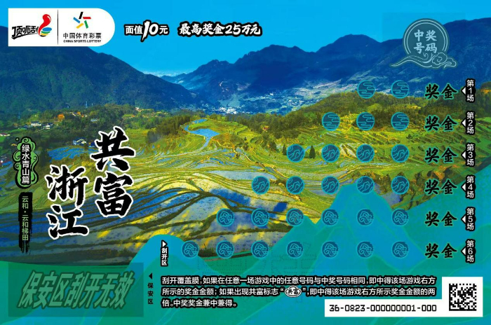 在浙江每一个体彩实体店,都可看到这样一套主题即开票——“共富浙江”,该票首款系列是“绿水青山篇”,以浙江全省10处山水风光为背景,活动走进了其中一处——云和梯田。
