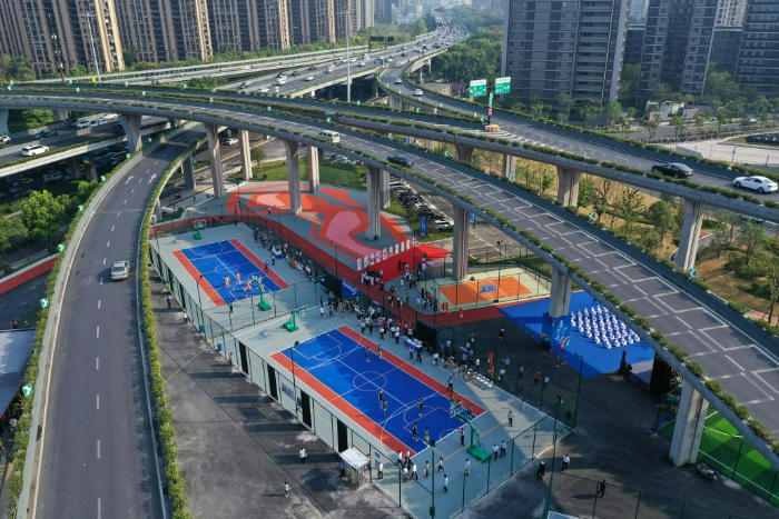 位于杭州市拱墅区文晖街道石德立交西南象限桥下的杭州篮球公园,是全国最大的桥下空间嵌入式篮球公园,项目总投资1600万元,其中体彩公益金拟投入50万元,辐射周边1.5公里范围内1.84万居民,场地覆盖青少年、中青年及中老年人的多种运动需求。目前日均客流500人次左右,双休日超800人次,是周边家门口锻炼的极佳场所,也成为杭州户外篮球的网红“打卡”地。