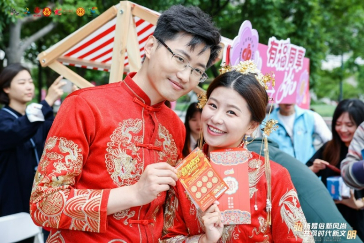 在现场,有个特别的摊位受到新人们的欢迎。当天登记结婚的新人们有不少一走出登记大厅就直奔福彩摊位,体验各种饱含美好寓意的即开票,感受福彩公益文化,上海福彩还给参与婚礼仪式的百位新人赠送了婚庆主题刮刮乐“喜事成双”,让福彩刮刮乐以公益之名连接起小家之爱和慈善大爱。