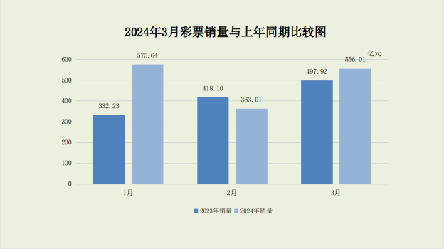 3月份,全国共销售彩票556.01亿元[1],同比增加58.09亿元,增长11.7%。其中,福利彩票机构销售188.77亿元,同比增加34.52亿元,增长22.4%;体育彩票机构销售367.24亿元,同比增加23.58亿元,增长6.9%。彩票销量增长主要原因是即开型彩票购彩群体和基诺型彩票销售网点规模稳步扩大。但受去年同期基数较高影响,同比增速有所回落。