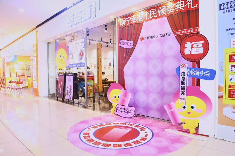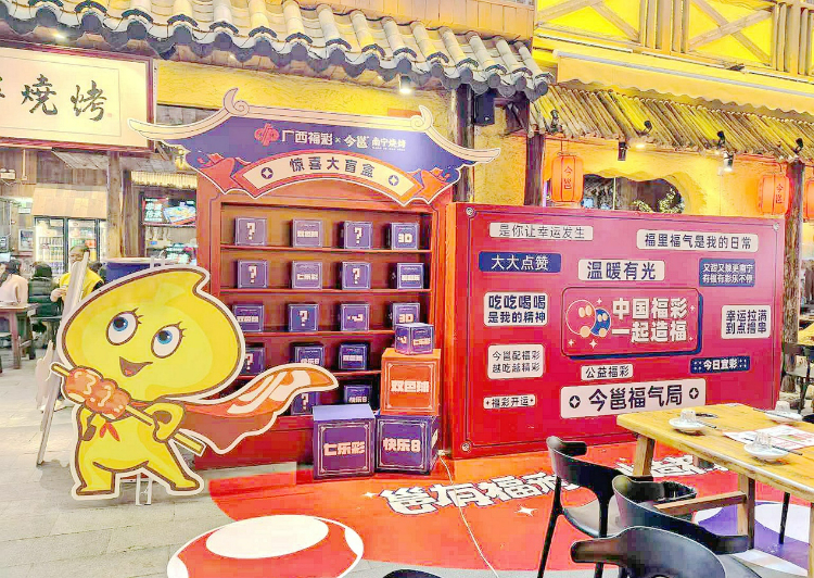广西福彩中心大胆探索,为公益福彩形象注入新内涵,积极搭建与年轻群体的沟通桥梁。携手今邕南宁烧烤打造《今邕福气局》,福彩元素融入烟火烧烤,顾客尝美味之际能知晓福彩公益故事,开启“福彩 + 美食”跨界体验;联合萃茶师推出《一杯福茶温暖一座城》主题活动,将清新茶香与福彩温暖相融,市民手握一杯福茶,品味的不仅是茶饮的甘甜,更是福彩传递的爱心,是一场 “福彩 + 茶饮” 的创意邂逅。活动现场,大幅盲盒打卡墙夺目吸睛,红蓝拼色时尚动感,萌趣福豆憨态可掬,满含美好寓意的陈设营造温馨氛围。墙上诙谐文字与醒目的公益口号相映成趣,让人在会心一笑间,轻松感受福利彩票的公益力量。