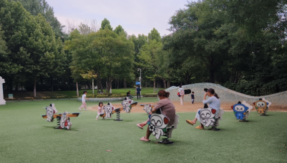 除了健身场地,锦和公园还融入了许多便民设施,为市民提供更加贴心的服务。公园内随处可见体彩吉祥物乐小星的身影,憨态可掬的形象为园区增添了独特的活力。在儿童乐园区,两个可爱的乐小星坐在8米高的集装箱滑梯设备上,成为孩子们玩耍互动的标志性景点。同时园区还增设了花草提示牌、挂衣钩等贴心设施,让健身体验更方便、更舒适。