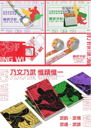 设计说明:本设计聚焦天津精武镇,立足爱国主义思想和强烈的民族精神,从中华武术和霍元甲先生的武术招式上获取创作灵感,色彩上组成丰富、冲击力强;造型上把握武术动态,从武魂、武境、武韵、武颂四个方面呈现精武文创。