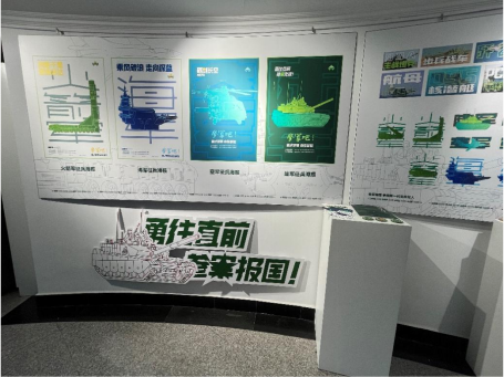 最后是关于布展物料以及模拟征兵现场的内容设计,包含 KT 展板、条幅挂布、征兵宣传单、明信片等。所有设计内容均以动态海报中的内容元素为基础进行再设计,形成较强的系统性展示。