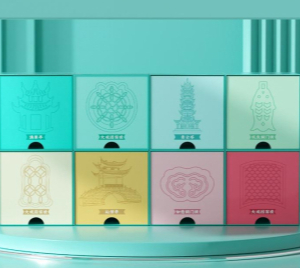 内置八个糕点抽屉盒,中国人喜欢的吉利数字8。抽屉盒结构源自古代装珍宝的箱子,盒面再现“上海大观园”的建筑和窗棱元素,一景一故事,一口一美味。
