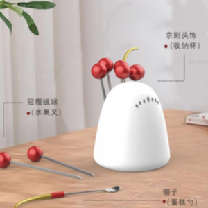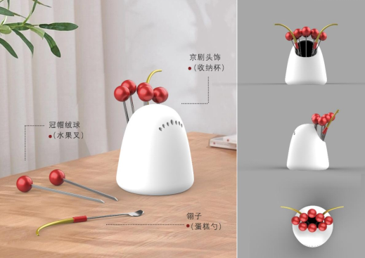 设计说明:这款水果小餐具设计以中国传统文化京剧戏剧头饰为元素,将其提炼重构与生活中小餐具(勺子、叉子)相融合,戏如人生——尝尽人生百态,既具有实用性、摆放在桌面上,又可以当摆件观赏,作为文创产品同时可以宣传国粹京剧文化,又让家居用品充满趣味性。