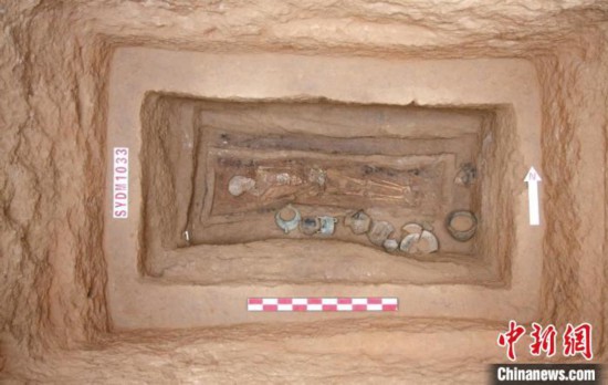 据该考古发掘项目领队谢尧亭介绍,大河口1033号墓的墓葬规模属中型墓,墓底中部有一腰坑,其中殉兽一只。根据以往的研究,M1033的年代为西周中期前段。从墓葬规模、随葬品种类和数量分析,墓主为霸国的一位中等贵族的夫人。(胡健)