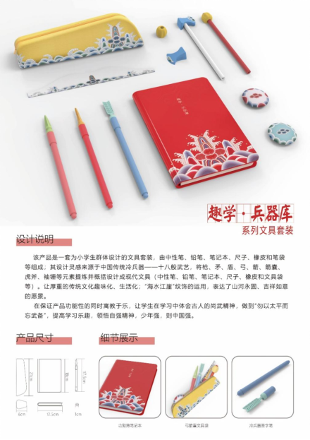 设计说明:趣·学兵器库系列文具套装,是一套为小学生群体设计的文具套装,由中性笔、铅笔、笔记本、尺子、橡皮和笔袋等组成。其设计灵感来源于中国传统冷兵器——十八般兵器,将枪、矛、盾、弓、箭、箭囊、虎斧、袖锤等元素提炼并概括设计成现代文具(中性笔、铅笔、笔记本、尺子、橡皮、笔袋和橡皮等)。让厚重的传统文化趣味化、生活化。“海水江崖”纹饰的运用,表达了山河永固、吉祥如意的愿景。