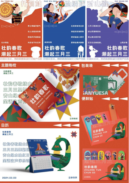设计说明:本文创产品设计以“潮起三月三,壮韵唱新篇”为设计理念,立足中华优秀传统文化,赓续非遗薪火相传。