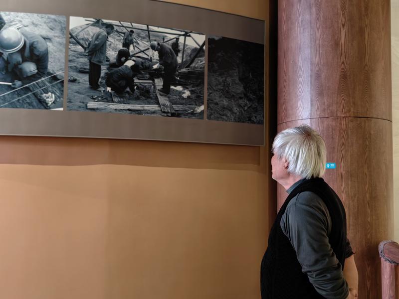 2024年4月8日,龙京沙在里耶秦简博物馆凝望2004年秦简发掘现场的照片 。新华每日电讯记者翟翔 摄