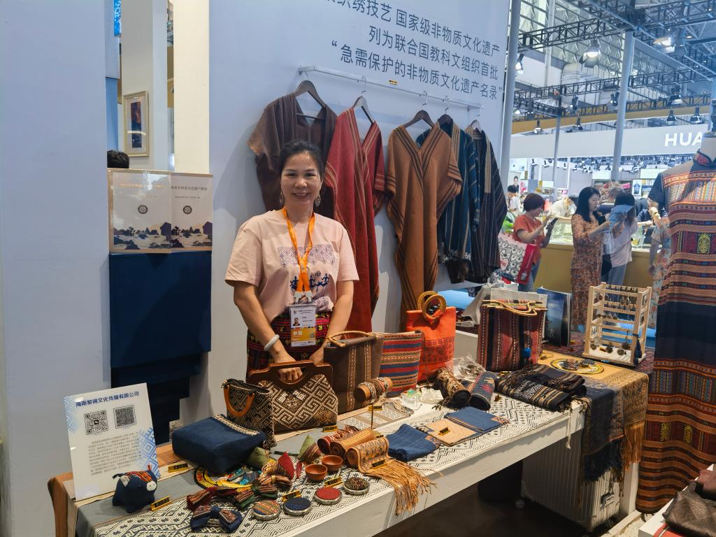 以传统黎锦技艺开发出的文创产品亮相展台。新华社记者赵叶苹 摄