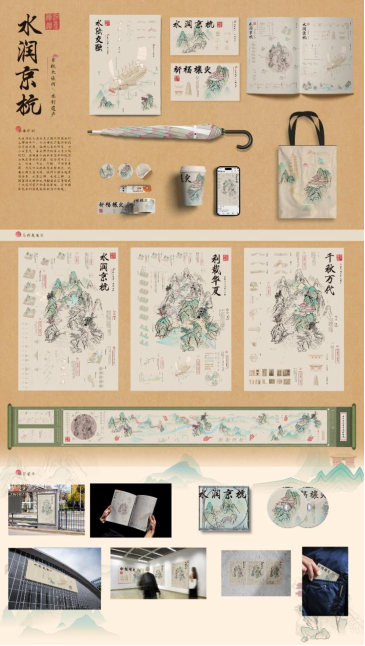 设计说明:大运河是人类历史上超大规模水利工程的杰作,按照工程系统类别分类,水源工程、水道工程、工程管理设施和运河附属建筑等组成了大运河遗产的基本框架,是中国传统水利科技成就的集中体现。启发于扬州深厚的大运河文化,根植于运河遗产,通过信息可视化的方式,在山与水交融的古韵场景下身临其境的感受千年大运河文化下中华民族智慧的结晶和中华民族的决心与勇气,与山与河与自然和谐共处的美好愿景。