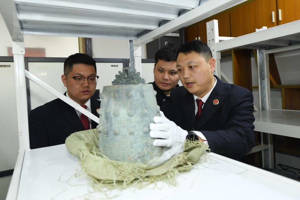 图为检察机关办案人员查看被盗的青铜编钟。(淮安市检察院供图)