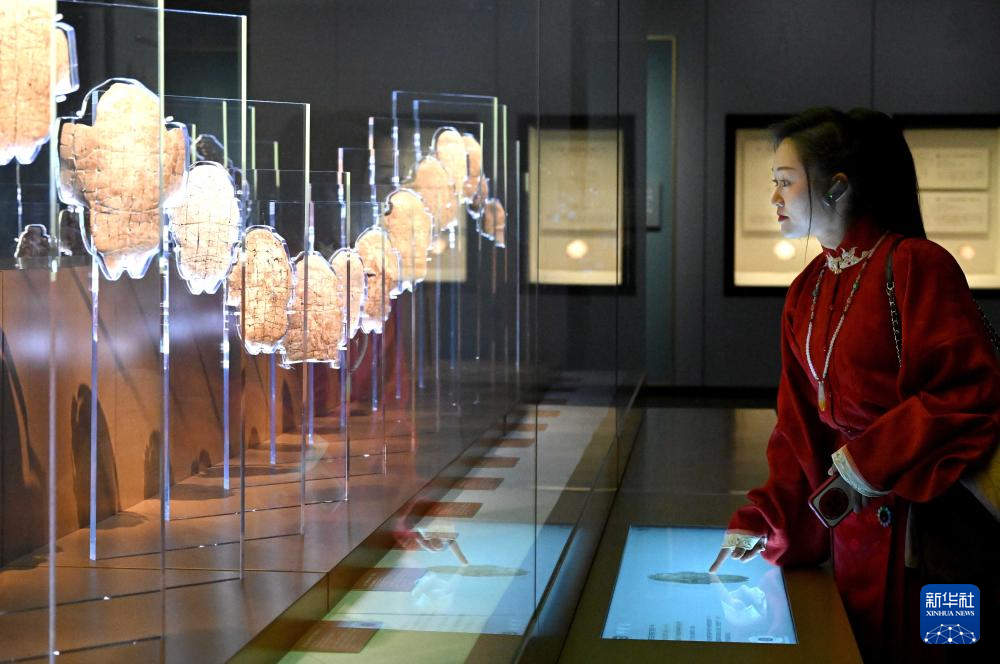 2024年2月26日,参观者在河南安阳殷墟博物馆新馆内观看展出的刻辞卜甲。