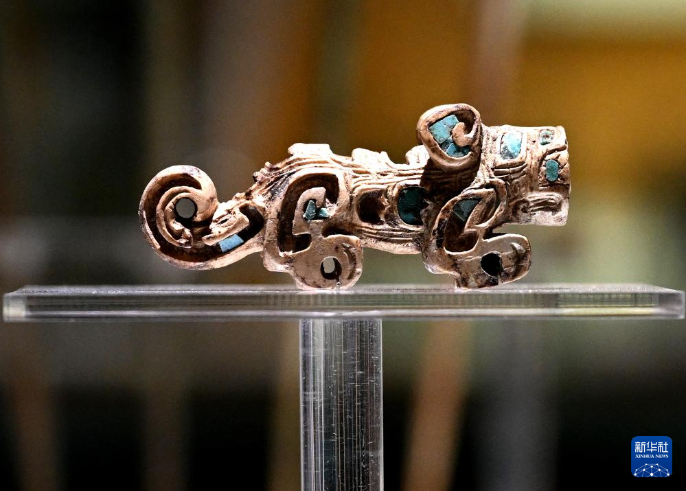 这是2024年2月23日拍摄的河南安阳殷墟博物馆新馆内展出的嵌绿松石骨虎。