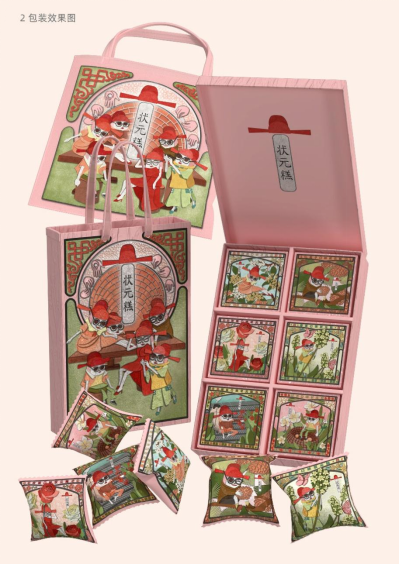 设计说明:状元糕是中国传统民间小吃,最初包装简单,且只有一种口味,但随着各种民间特产逐渐发掘出来,状元糕也开始大众化、国际化。