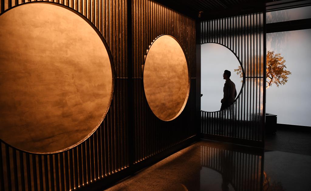 圆形拱门、木色飞檐、湖蓝色天花板……香港故宫文博馆的“下江南”中餐厅,处处充满了江南园林的写意。“装修设计本身讲的就是康熙皇帝下江南的故事,康熙皇帝在杭州题了很多诗,其中就有平湖秋月,所以店面包括餐单设计都是以西湖和月亮为元素,让顾客一进门就进入下江南的故事氛围里。”吴振宇说。