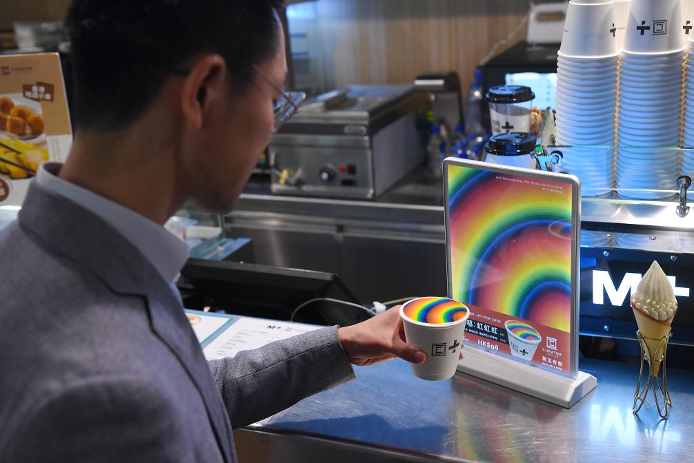 在香港视觉文化博物馆M+的咖啡店,市民李小姐惊喜地发现,这里竟然有一款彩虹咖啡,其图案色彩与前不久在此展出的日本彩虹艺术家的作品一模一样。得知这是经作者授权的艺术打印咖啡,李小姐立刻点了一杯,并开心地自拍留念。