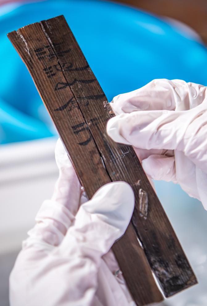 2024年4月16日,在荆州文保中心拍摄的经过脱色后饱水保存的王家嘴楚简《乐谱》。