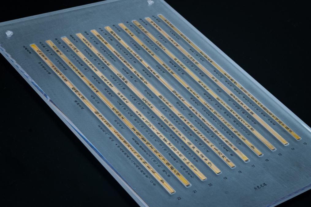 2023年5月20日,在荆州文保中心,修复人员查看修复完成的简牍。