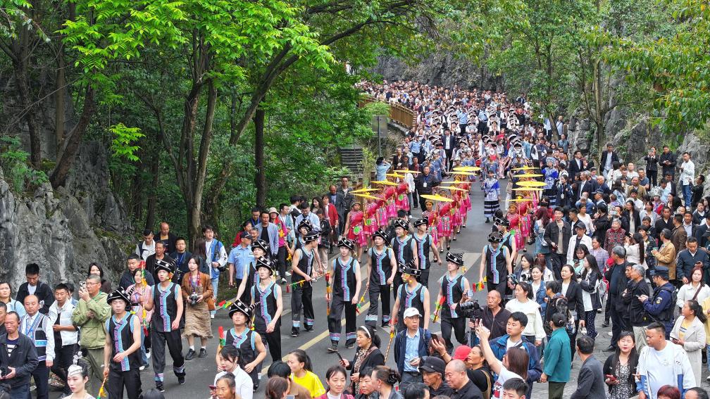 22日的花山节开幕式在世界地质公园兴文石海景区举行。《笙动兴文》《浪漫石海》实景表演精彩上演,身着盛装的苗族儿女吹芦笙、打莲枪,载歌载舞巡游,与游客融成一片。