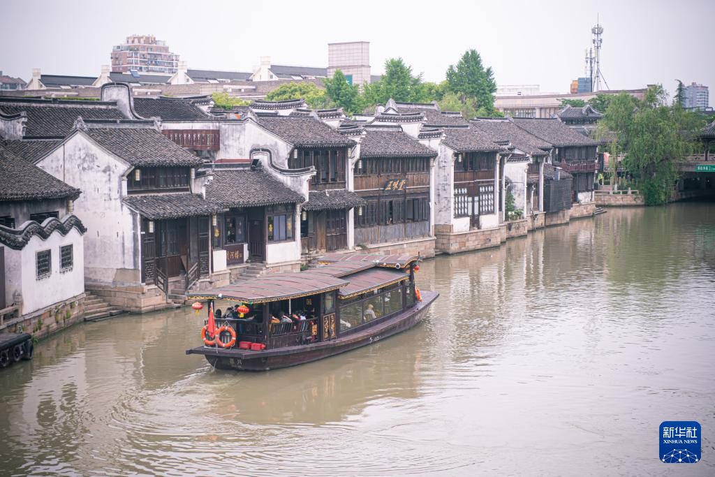 4月26日,游船行驶在流经嘉兴市月河历史街区的京杭大运河上。