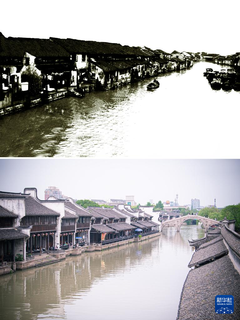 拼版照片:左图为1979年的嘉兴市月河历史街区北丽桥口(资料照片,庞艺影摄);右图为4月26日拍摄的嘉兴市月河历史街区北丽桥口(新华社记者江汉摄)。