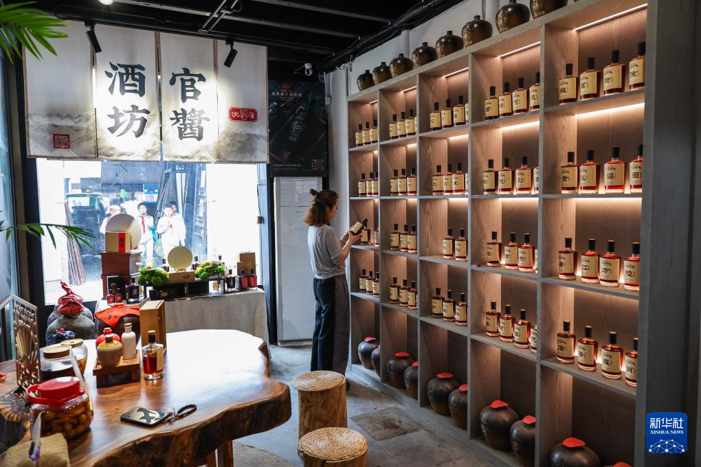 4月26日,游客在月河历史街区的特色黄酒店选购当地特产黄酒。